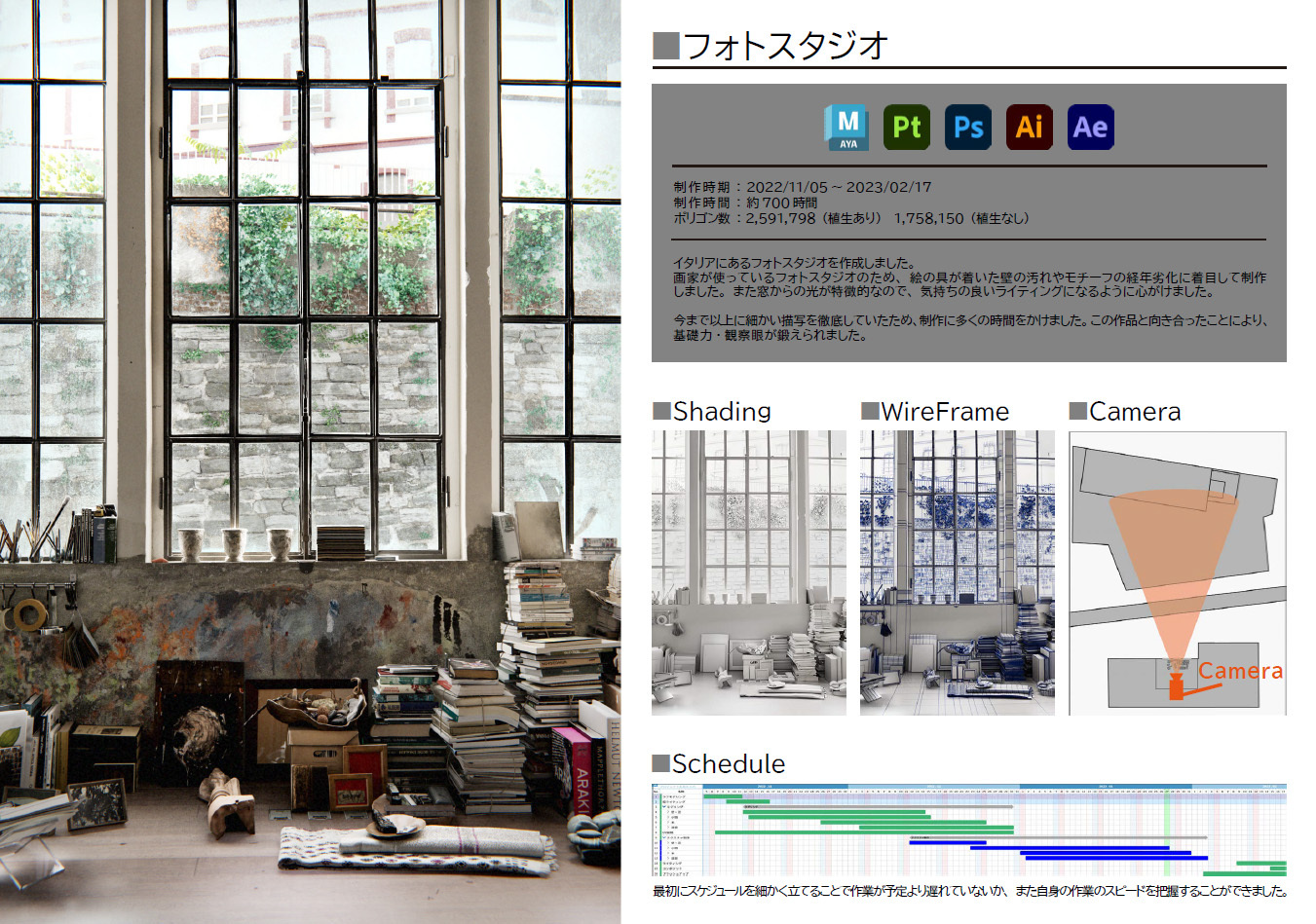 そこからはがむしゃらに行動していました。大学ではアトリエで油絵を描き、移動中の電車では座学のレポートを書き、自宅や専門学校ではひたすら3DCGの勉強をしていました。日々の生活をデザイナーになるという夢に向けて費やしていたのは、今振り返っても大きな転機だったと思います。