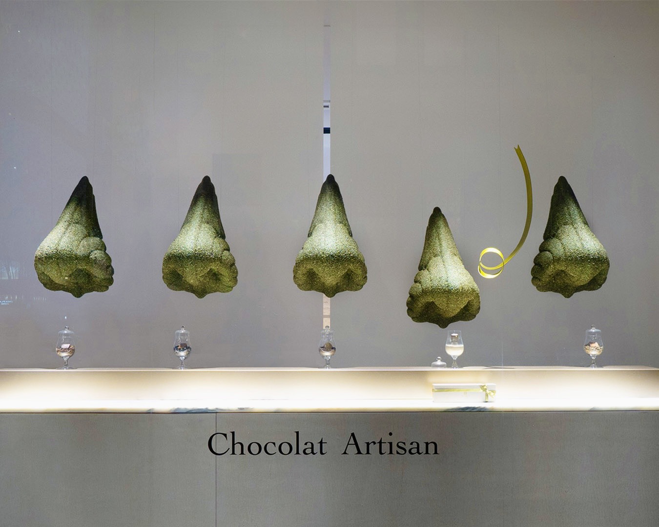 限定ショコラ・フレ「スペシャリテ」のテーマである「アロマ ジャポネ」に着想を得て、チョコレートと日本茶のアロマを重ね合わせ、茶畑の畝を思わせるフォルムそのものを、鼻・唇・まぶたへと見立てたオブジェで構成しました。