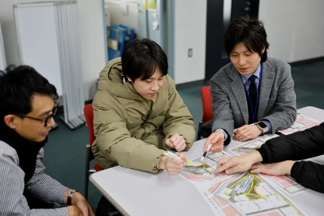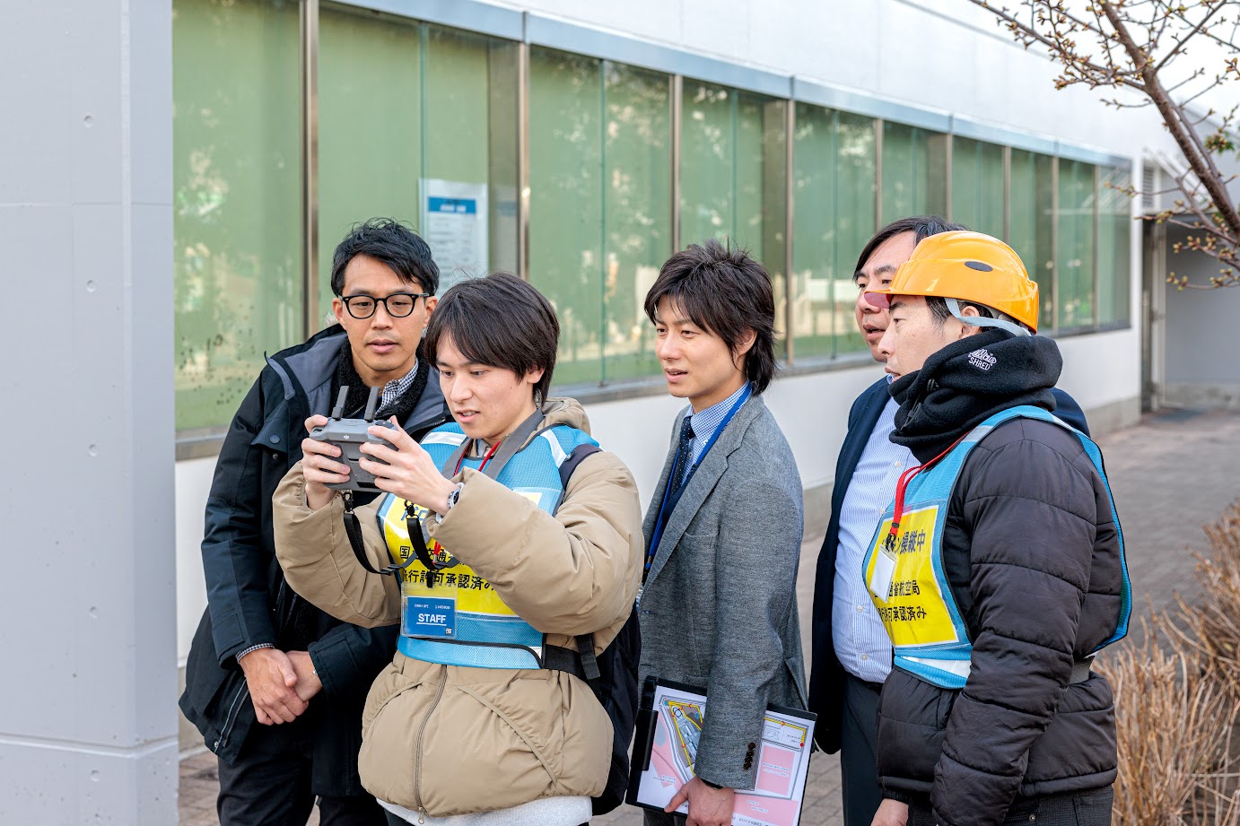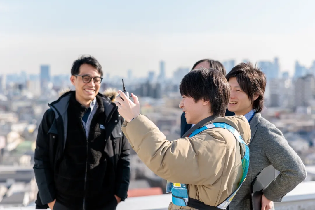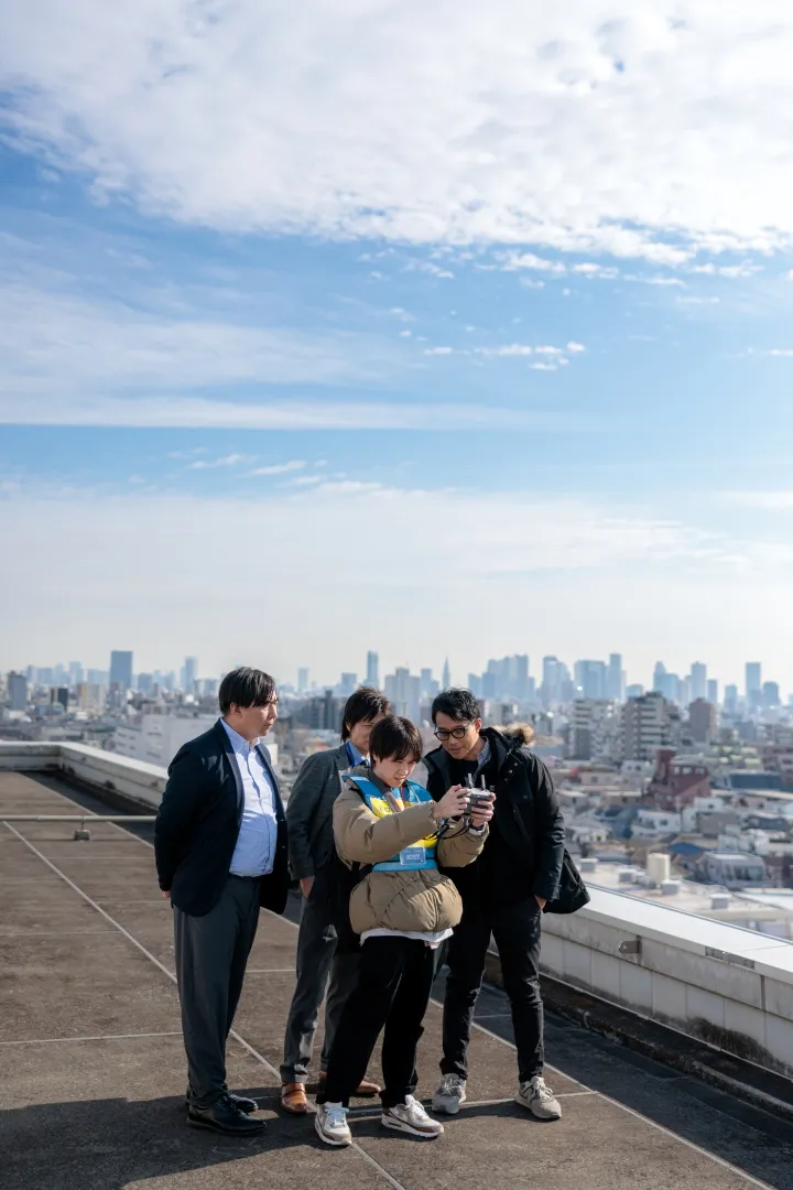 キャンパス空撮の実施にあたり,土屋さんを中心に穴澤准教授,事務局から御厨教務課長,広報担当の伊藤(翼),記録で入試係の吉沢などが協力しました。都心かつ住宅地で江古田駅に隣接する校舎をどのように安全に撮影するか,受験生を中心に多くの学外者に魅力的な校舎を伝えるにはどのような角度からの撮影が有効か,学生・教職員で忌憚なく意見を出し合いました。