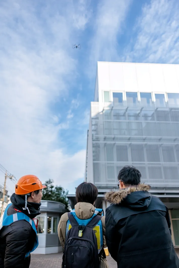そのPR動画の一部にドローンで撮影した映像を使いたいという話でしたが、3年次から自発的に研究を行い国家資格を取得した土屋さんの準備が素晴らしく(都心での空撮は許可の申請や事前準備に時間がかかります),それ以上に学生さんの熱意に心動かされました。