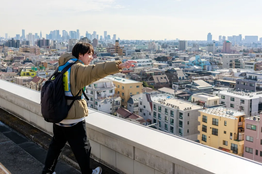 撮影地点は西棟屋上へ,普段は学生,教職員は立ち入ることができない空間ですが,江古田キャンパスが東京都心の真ん中にあることを再認識させられる,絶景ポイントです。