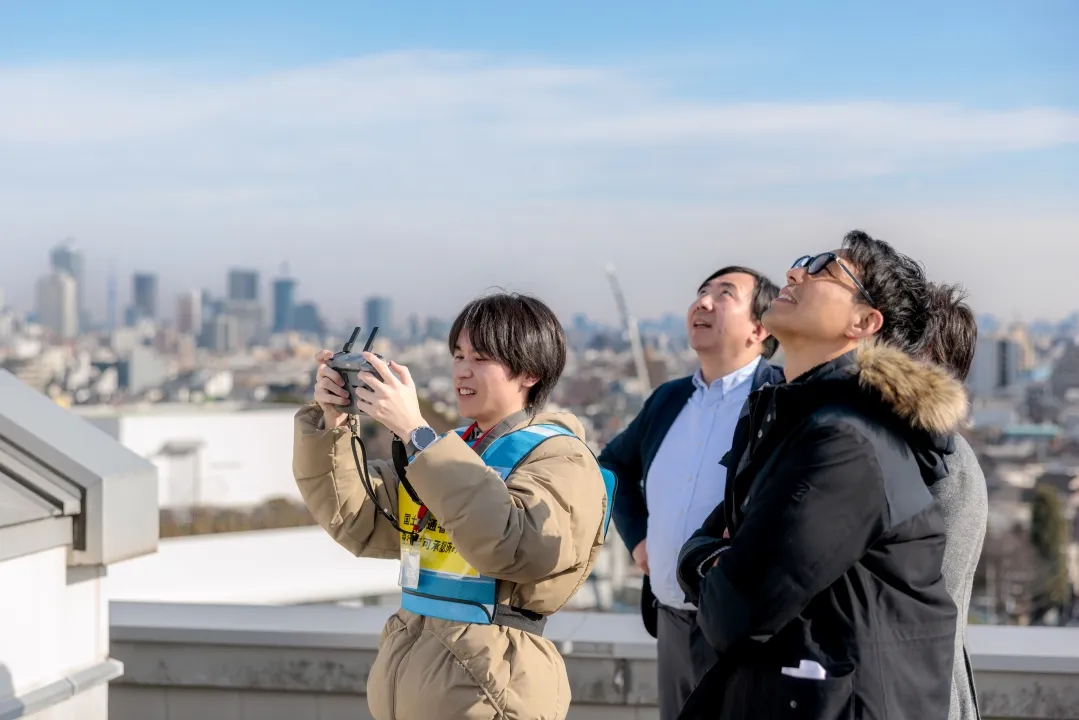地上から目視での撮影を終えて,今度は江古田キャンパスの最高度から,遠隔操作でキャンパスの全景を撮影します。